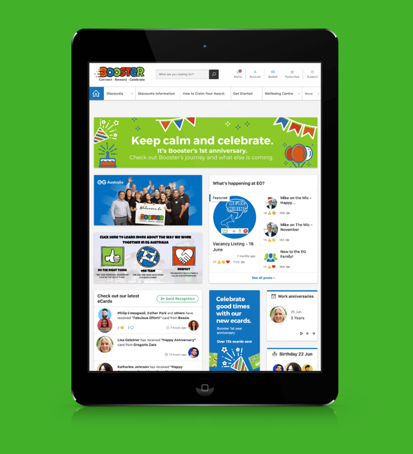 Since launching Booster, 89% of EG’s employees are actively using the platform, and it’s become the go-to place for accessing existing and new employee benefits, as well as a primary channel for communications. The team later added employee reward and recognition to the platform, with peer-to-peer eCards and manager-led monetary awards to further boost connections across the business, and a Wellbeing Centre to provide extra physical, nutritional, financial and mental health support. The first ten months of launching the platform delivered over $288,000 worth of savings through its employee benefits hub and distributed 5,356 monetary awards to its hard-working Australians all around the country!