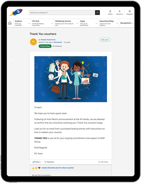 We could share answers to frequently asked questions, link people to resources supporting their mental and physical health, like our EAP and the Wellbeing Centre, and then remind people of the good news happening in the business too, because we had company-wide recognition in the same place.