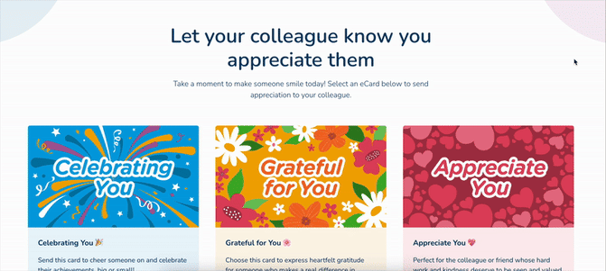 This is where an employee recognition platform can help organisations graduate from manual, time-consuming 'thank you's, to more frequent and continuous recognition through a social recognition wall of eCards. Allow others to 'join in' on the celebratory moment by adding comments or reactions to extend the recognition far beyond the postage it took to post a card. Your eCards can even offer monetary recognition, with a reward voucher added to it.