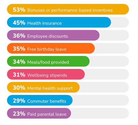 Topping the list, more than half (53%) of employees value bonuses and performance-based incentives as a key benefit. This signals a clear preference for financial rewards tied to achievements, giving companies a strong reason to implement well-structured incentive programs that recognise and reward high performance.