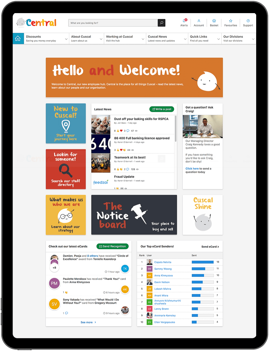 As the name suggests, Central is the centrepiece of the employee experience at Cuscal – the colours, images and language used across the platform reflect the energetic, fun and friendly culture of the organisation. Everything from company news and the “A-Z Guide for Working at Cuscal” is available alongside its company- wide recognition and reward program, BOB, and access to exclusive employee discounts.