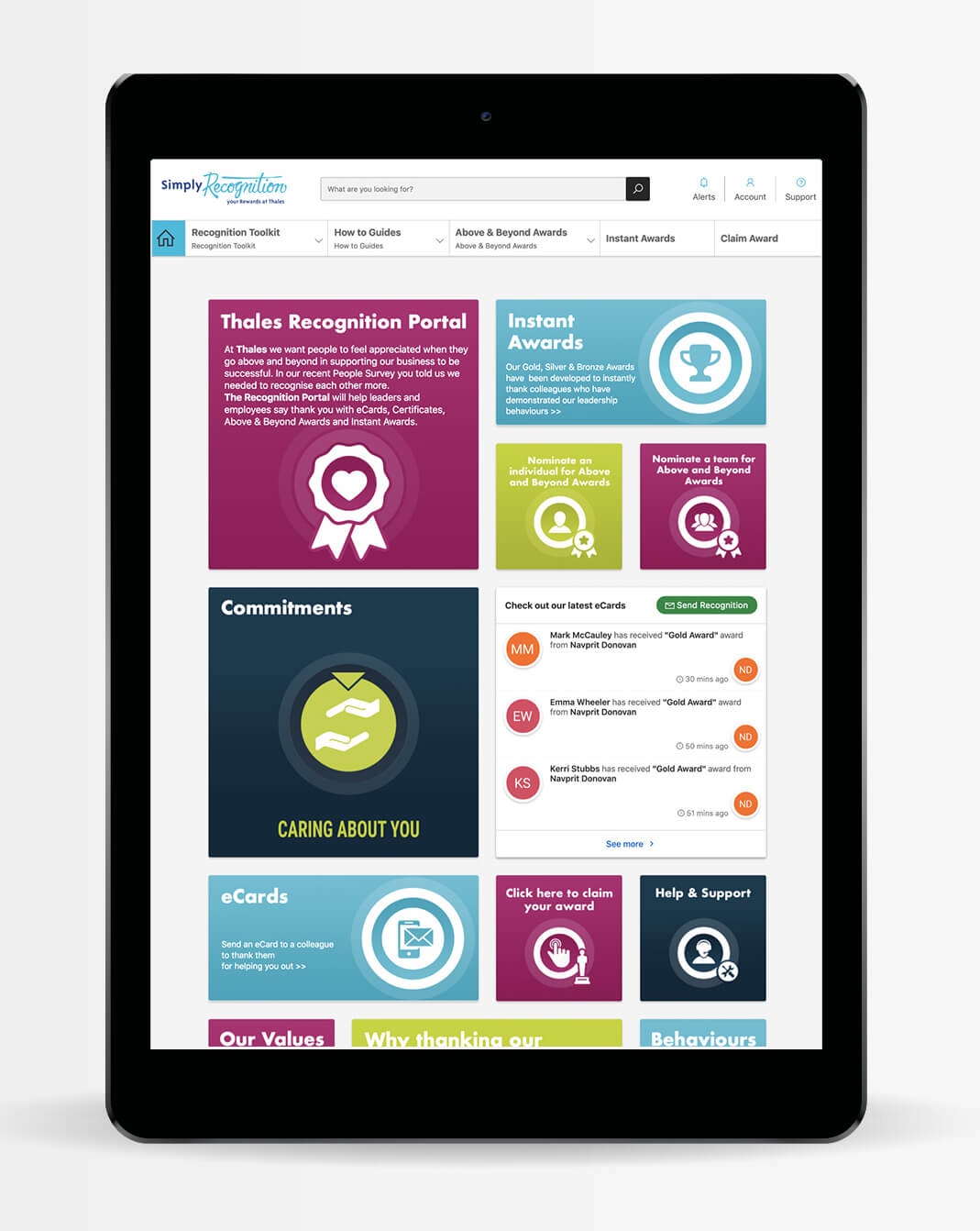 One of the biggest challenges facing the team was designing a program which would engage employees across the entirety of its workforce, including multiple and remote sites, shift workers, and offline employees. Any recognition offering had to appeal to people of all ages, as half of Thales' demographic is over 50.