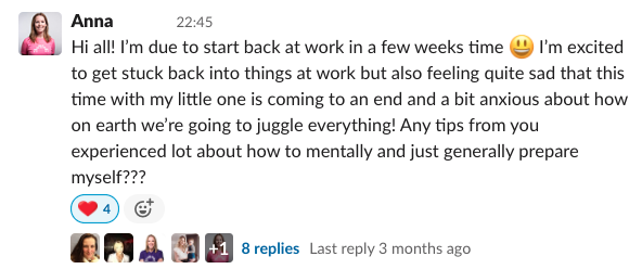 So if you haven’t already, create a dedicated "Parents Hub" on your employee communications tools, or a chat group to encourage parents to start sharing their questions and answers. Our RG Parents channel is one place where baby spam is 100% welcome. It builds a sense of community, and provides another place for our people to offer support – both tactical and emotional! – when things get a little hectic at home.
