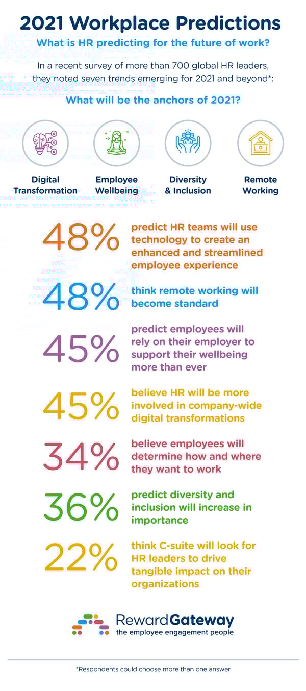 This year has shed light on other important topics like diversity, equity and inclusion, and issues of race and injustice. 35.6% of HR leaders surveyed predict initiatives surrounding these conversations will grow in importance in 2021.