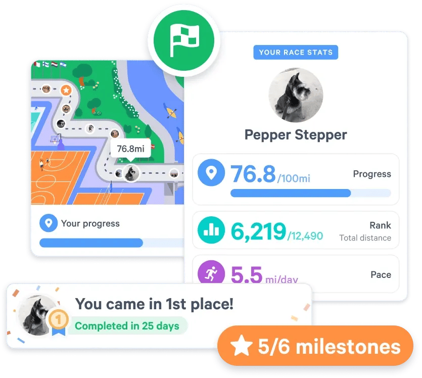 Discover our wide array of challenge modules designed to engage employees on individual, team and group levels. Have them race to the finish with a virtual race map, ignite competition with live leaderboards, encourage habit streaks and more!