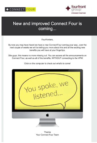 If you’re still opting for the email communication (as many do!), embedding a quick video is a good way to get more interaction and make the email more animated. My client Fourfront group is an award winning commercial office design specialist who in fact designed our very own London office! They hosted a number of launch videos on YouTube which link out from emails sent to employees, sent to 350 employees between October and November!