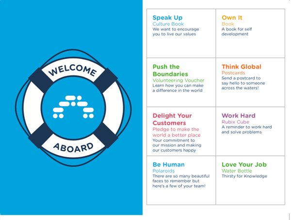 Onboarding programmes are successful when your newest employees feel empowered by your culture and understand what’s expected of them. Values-based welcome packs are our way of starting a new hire’s journey to making the world a better place to work. There are countless ways to increase your EVP with unique onboarding techniques that reflect your company culture and values.