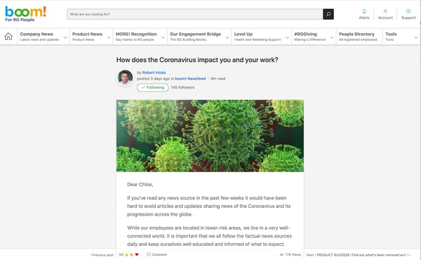 As I mentioned, we were able to quickly put an internal Coronavirus information hub in place, and also worked with our Client Success Team to make templates readily available for our clients to use, with full access to their dedicated Client Success Manager (CSM) to put it in place.