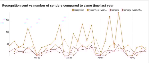 When you compare this to our recognition moments sent last year at the same time, the results are incredibly uplifting to see. Here’s a peek at our own Recognition dashboard (the orange is this year, compared to the pink from last year).