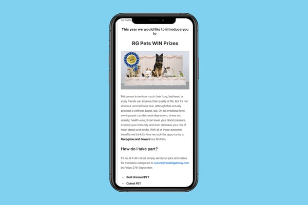Want a free option? Allow your people to introduce their pets at home. We used our employee experience platform to host what we called the 'RG Pets WIN Prizes.' Employees sent in photos of their furry (or not so furry) friends and winners were selected to win special prizes. Everyone in the company had visibility into the awards and it helped boost morale and connections across the globe.