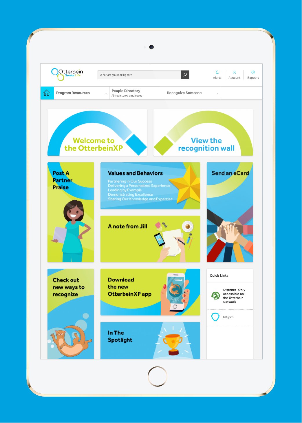 Now when partners log onto the platform, they’re greeted with a colourful, branded experience that showcases Otterbein’s values and behaviours, a note from Jill Wilson and a place to see top recognitions or, 'Spotlight Recognition,' which all help to bring them closer to one another and to the organisation. Alongside this, employees can send one another recognition and rewards, including greetings-based eCards like 'A Virtual High Five,' and values-based nominations such as 'Delivering a Personalised Experience.'
