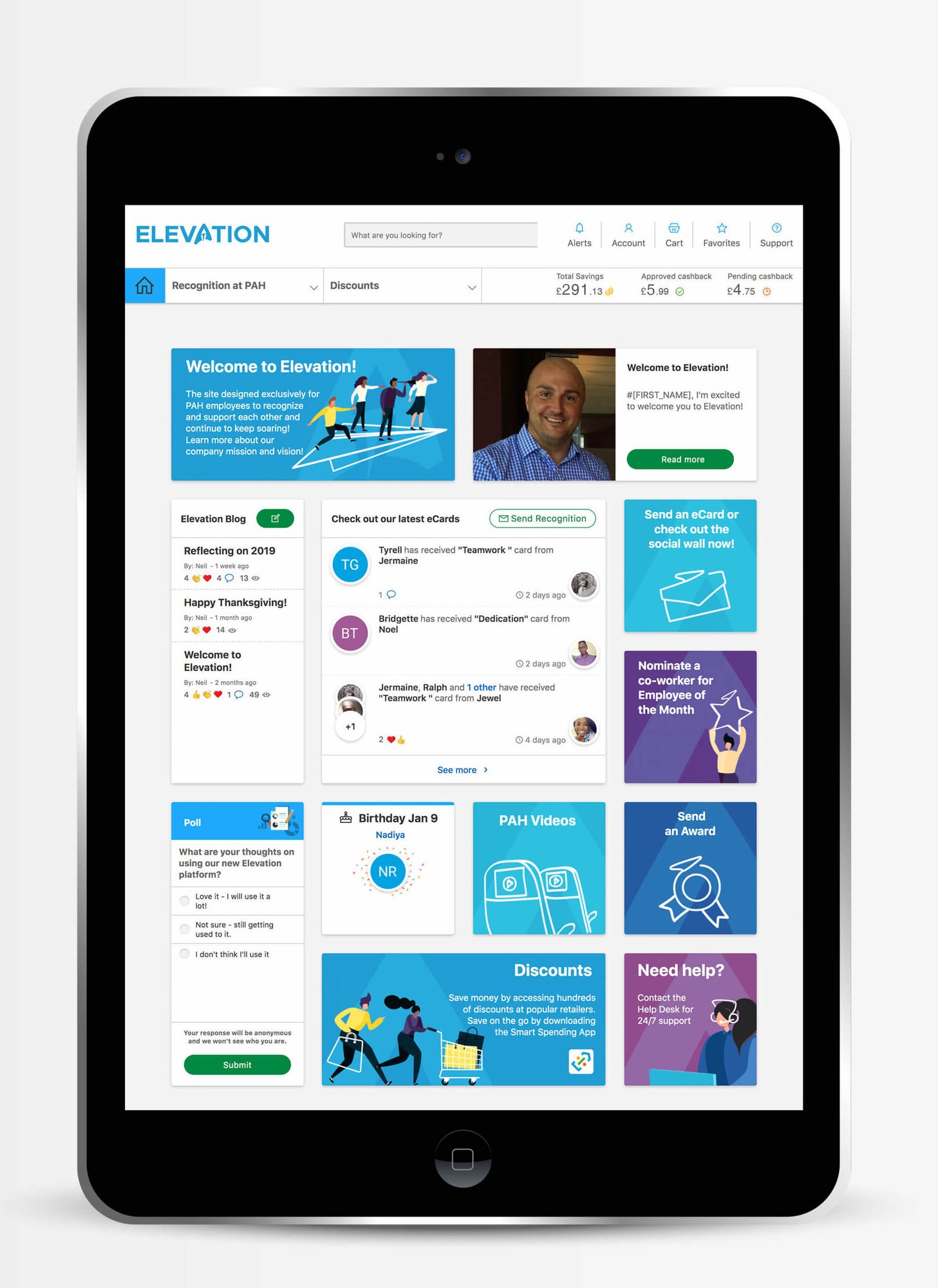 Bringing powerful communications and recognition together in one place was top of mind for PAH. The organisation partnered with Reward Gateway to launch its employer-branded employee engagement platform, “Elevation.” It’s on the platform that employees can send one another performance-based eCards to highlight good behaviour, such as “Customer Experience” and “Leading by Example,” alongside greetings-based eCards such as “Happy Anniversary” or “Congratulations.”